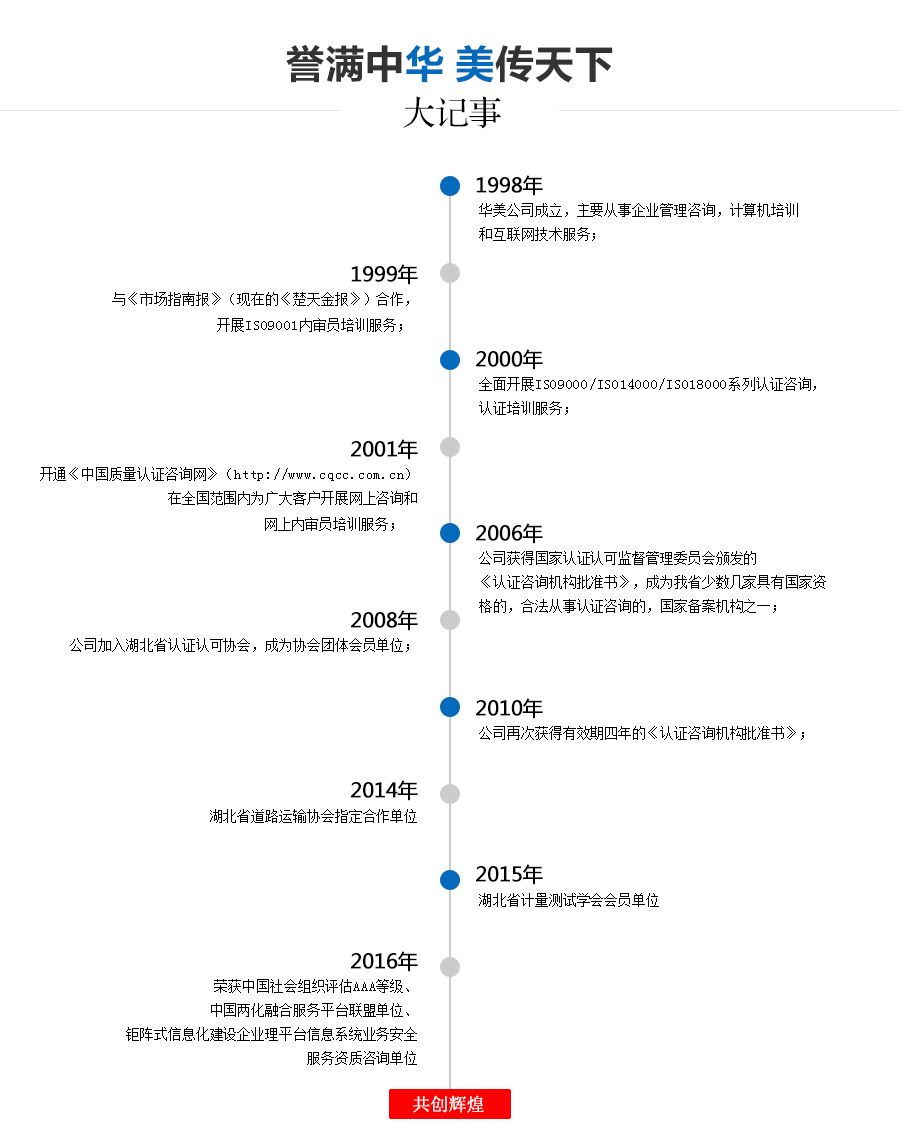 武漢華美認證咨詢有限公司是中國通信工業(yè)協(xié)會信息安全分會指定咨詢單位,是道路運輸協(xié)會會員單位,是湖北省計量測試學會會員單位,是兩化融合聯盟單位,是武漢市標準化院中小企業(yè)質量提升工程指定咨詢單位,是武漢經濟和信息化委員會服務補貼券接券單位。