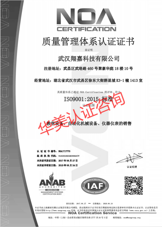 2017年武漢翔嘉科技有限公司與武漢華美認證咨詢有限公司合作開展了iso9001、iso14001、iso18001體系認證,并順利取得了iso9001、iso14001、iso18001體系認證證書。