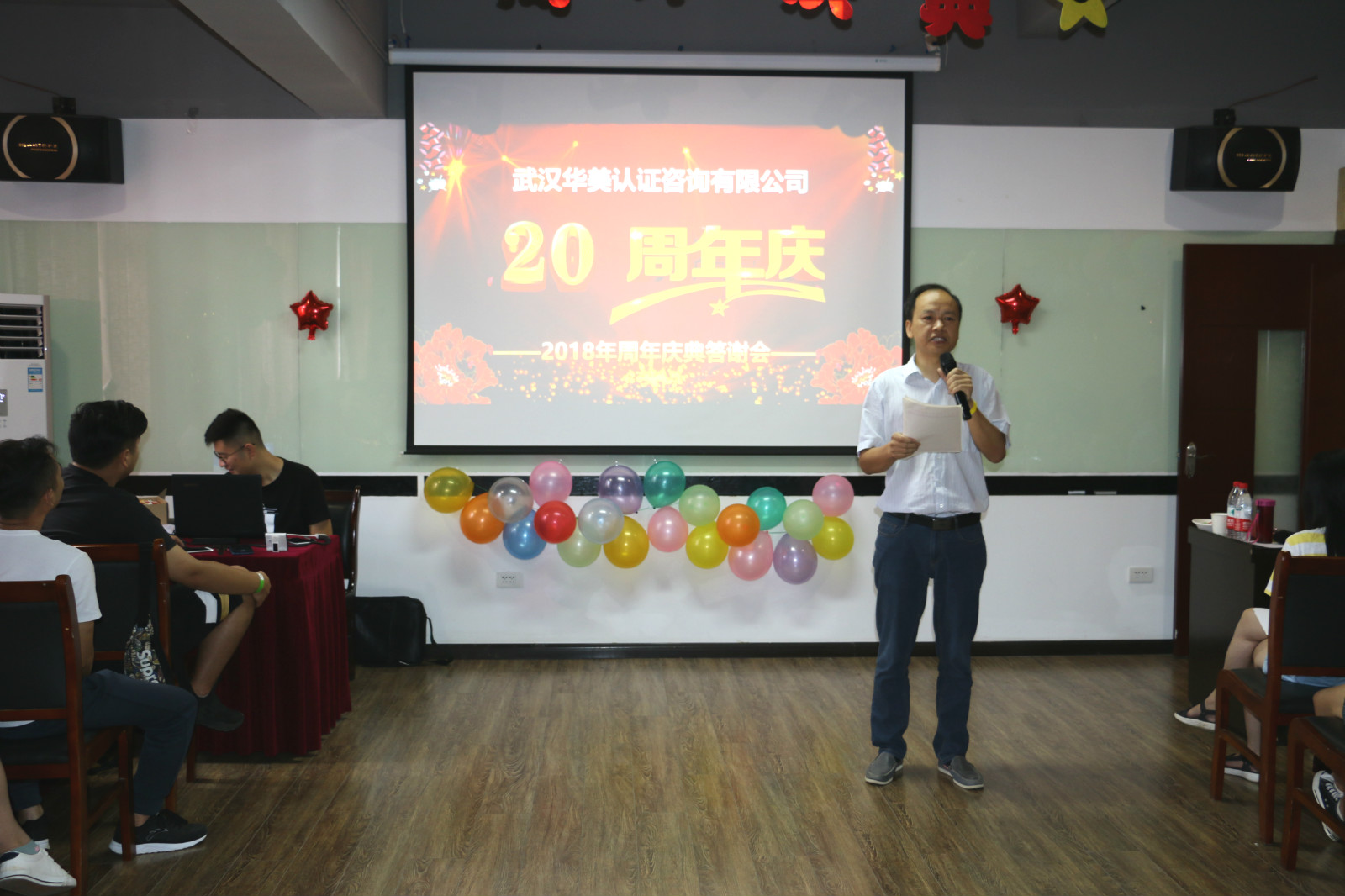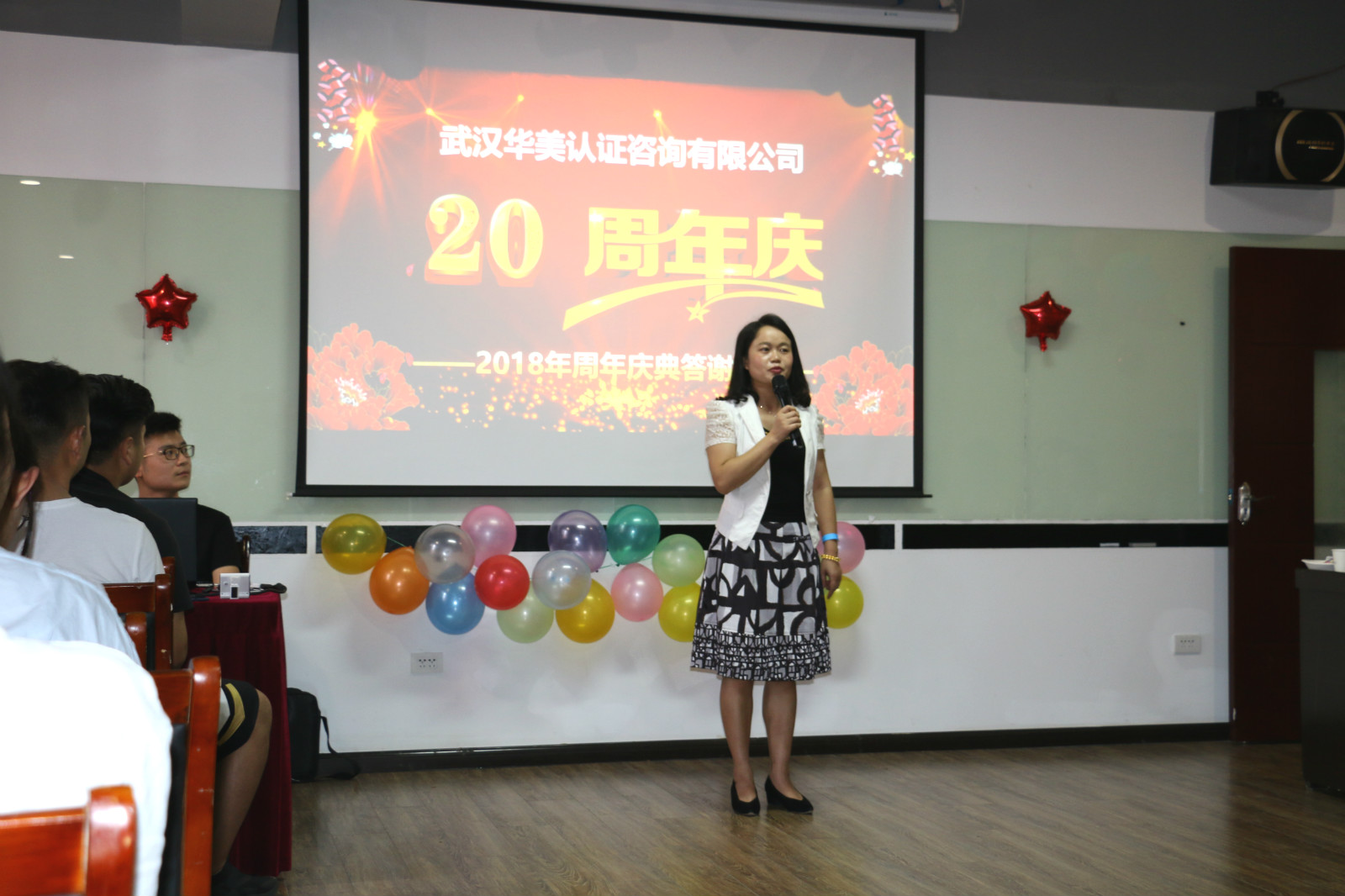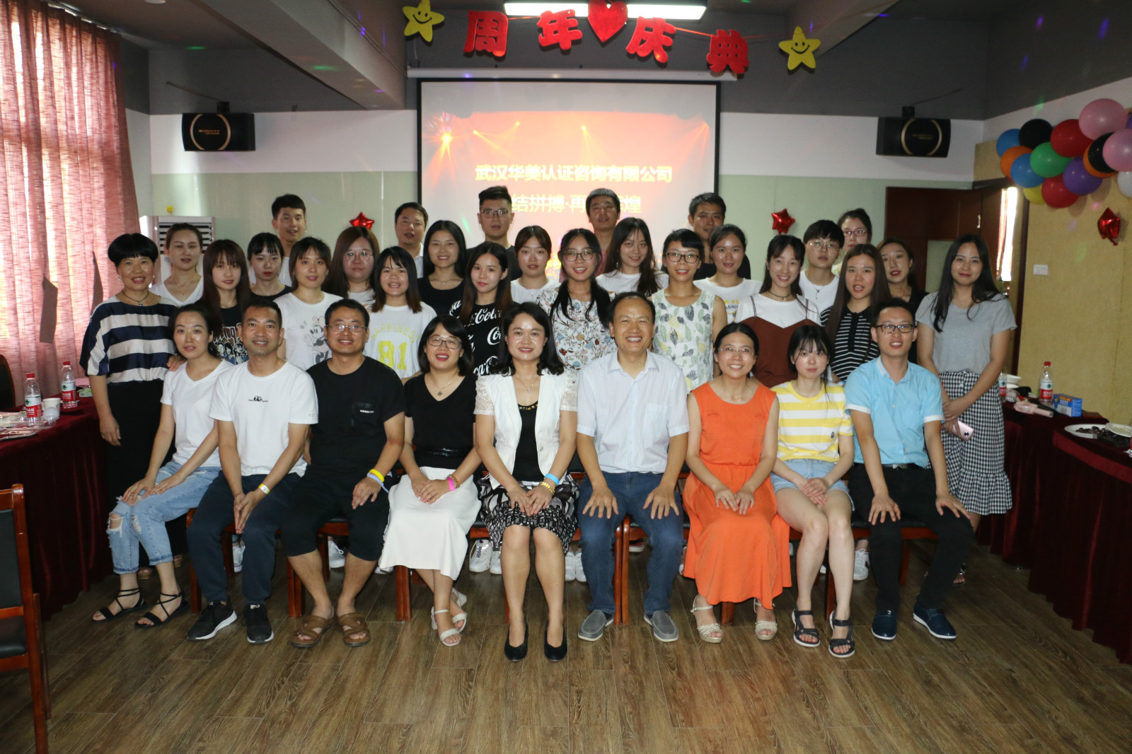 這一天,在武漢華美認證咨詢有限公司的培訓教室舉辦了一場盛大的周年慶聯歡會。除了華美的全體員工,還有湖北省華龍職業培訓學校、武漢華美今天教育有限公司、武漢市運安通信息科技有限公司等幾家公司的參與。現場氛圍熱情高漲,處處都引來歡聲笑語。