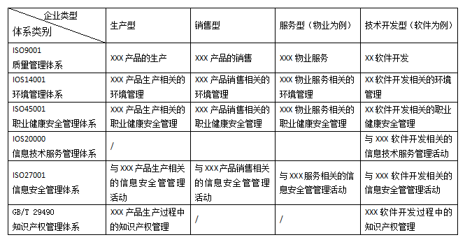 常見的生產類、銷售類、服務類、技術開發類企業,這些企業通常在做適合自身企業的管理體系時候,將會已自身的業務為基準,再加上體系類型的特定描述。